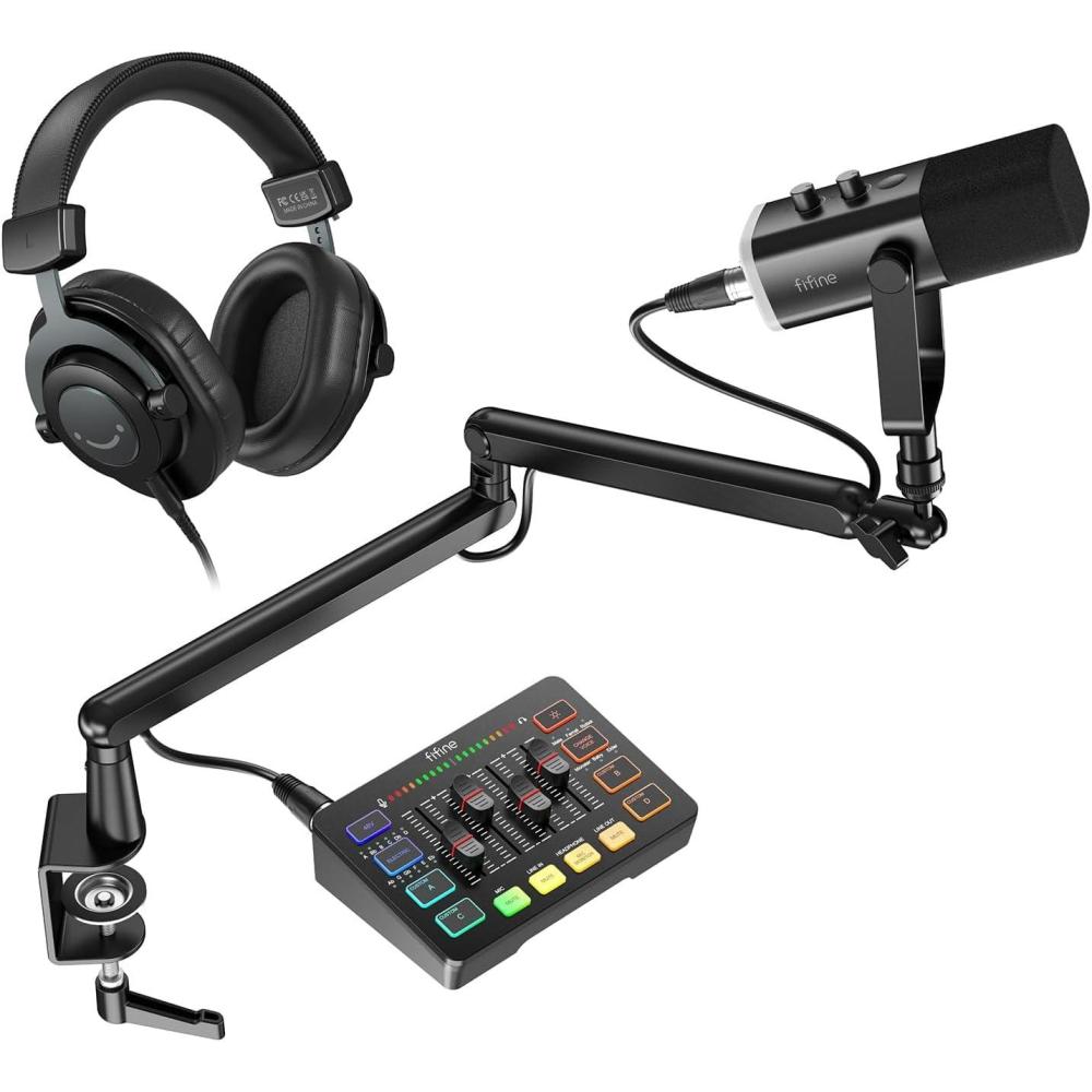 FIFINE Gaming Equipment Bundle with XLR/USB Dynamic Mic, Low Profile Arm, Audio Mixer, Over-Ear Headphones, XLR Cable for Streaming, Podcast, Recording, Vocal, Game Voice