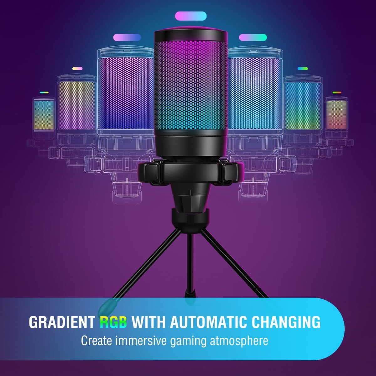 Gradient RGB & Quick Mute – With bicolored lighting, RGB alter seven color modes by itself in a gradient way. It adds carnival atmosphere with light-up computer setups, putting you in the fierce game arena. Quick mute button at the top is handy to touch. Even when you concentrate on the game, you can immediately mute your mic. RGB LED is off when the mic is muted to tell you working status. Prevent your streaming from accidents caused by forgetting to mute mic.