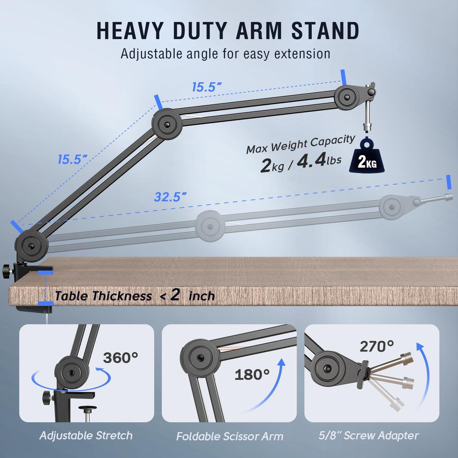 [Robust Boom Arm for for Precise Positioning] The adjustable boom arm made of heavy duty material give horizontal and vertical angle adjustment for freely position of the XLR dynamic microphone with pinpoint accuracy. Its sturdy construction and smooth joints let you adjust PC microphone with boom arm where you need it, ensuring optimal sound quality for every recording.