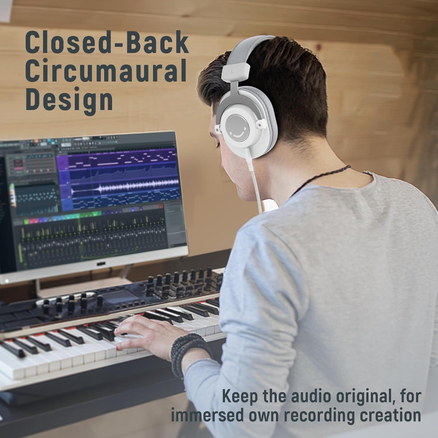 FIFINE Studio Monitor Headphones for Recording-Over Ear Wired Headphones for Podcast Monitoring, Streaming Comfortable Equipment with Detachable Cables 3.5mm or 6.35mm Jack, Black, on PC/Mixer-H8(White)