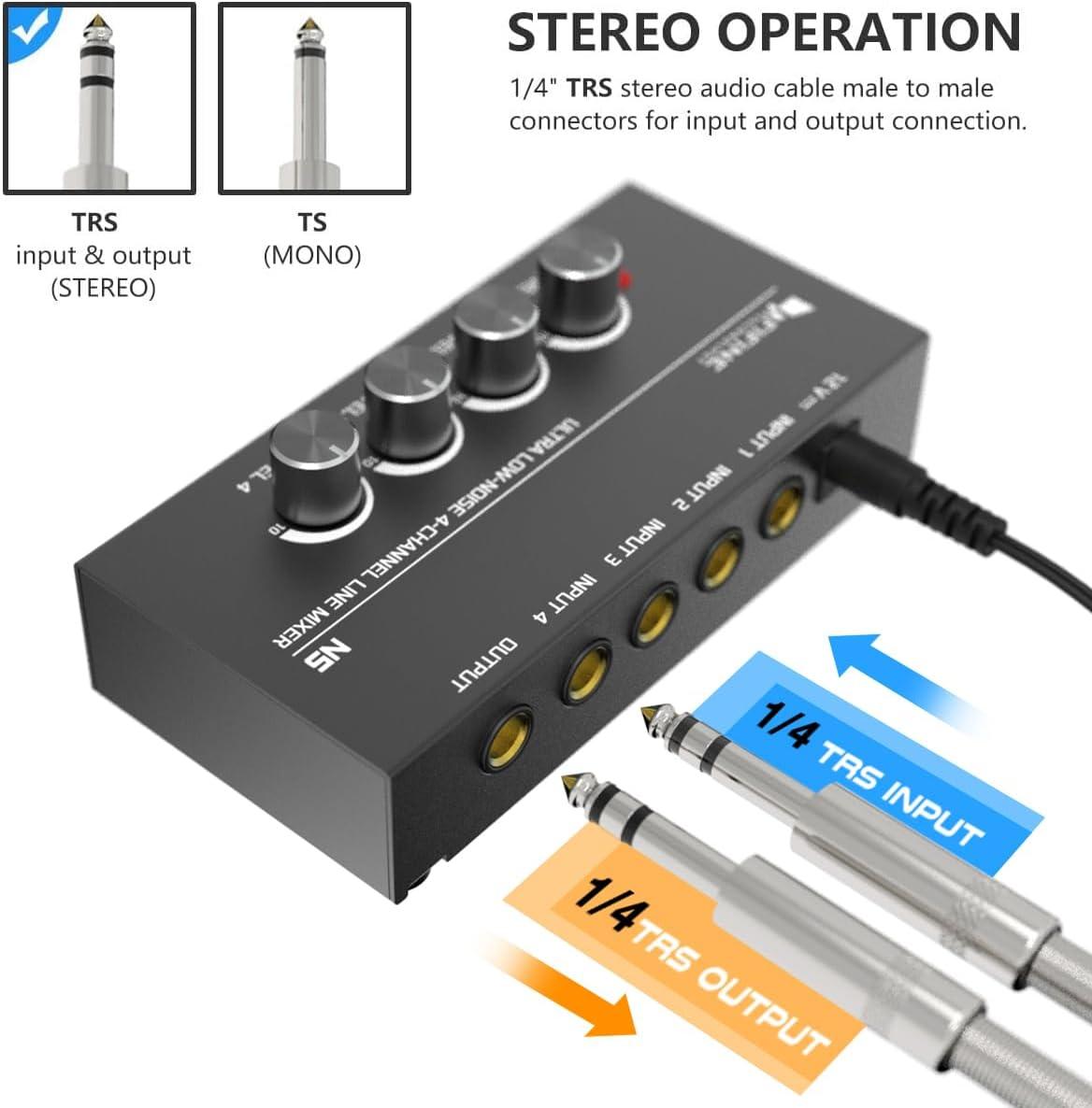 【Stereo/Mono Operation】Stereo version: You must use the 1/4” TRS stereo audio cable male to male connectors for input and output connection (1/4″ Male to Male Stereo Audio Cable (TRS Cable) is the key point). Mono version: Mixes down 4 mono signal inputs into 1 mono signal output (1/4” TS male to male connectors for input and output connection). TRS/TS cable is not included in package