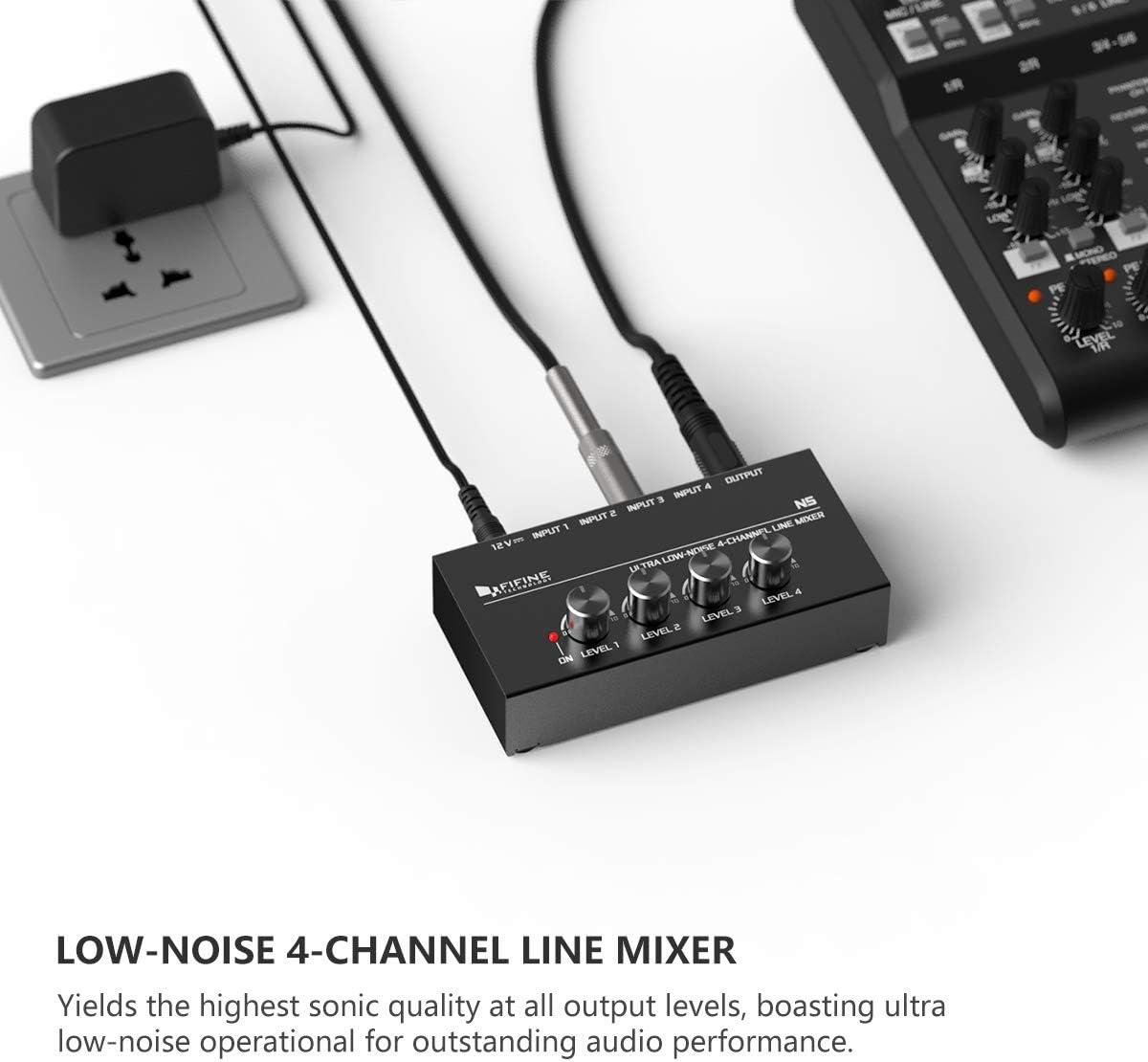 FIFINE Ultra Low-Noise 4-Channel Line Mixer for Sub-Mixing,4 Stereo Channel Mini Audio Mixer with AC adapter.Ideal for Small Club or Bar. As Microphones,Guitars,Bass,Keyboards or Stage Sub Mixer-N5