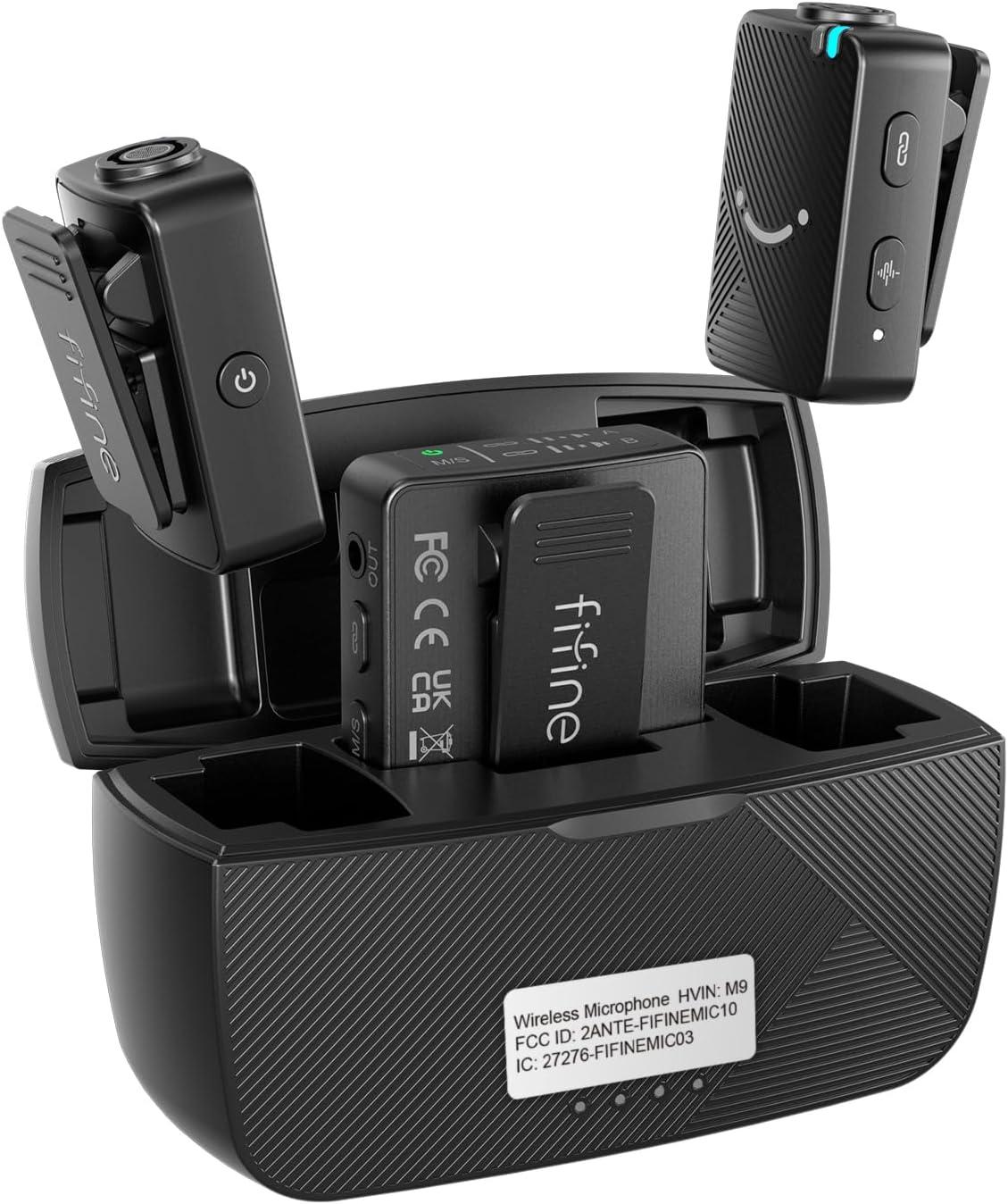 FIFINE Wireless Lavalier Microphone for iPhone/Android/Camera, 2 Pack Cordless Lapel Mic System for Vlog Recording Video YouTube/TikTok Interview, Condenser Clip-On Microphone with Charging Case-M9(Black)
