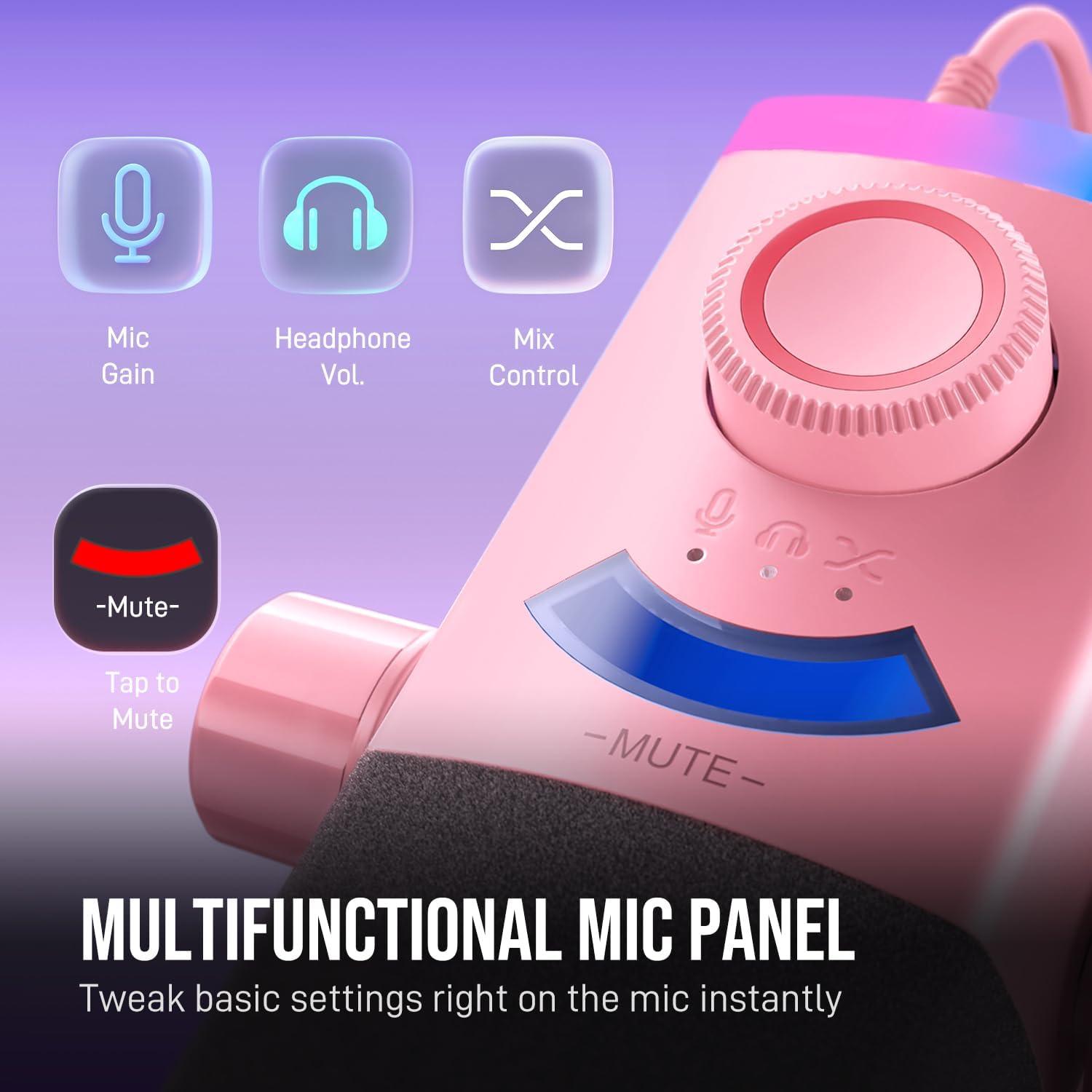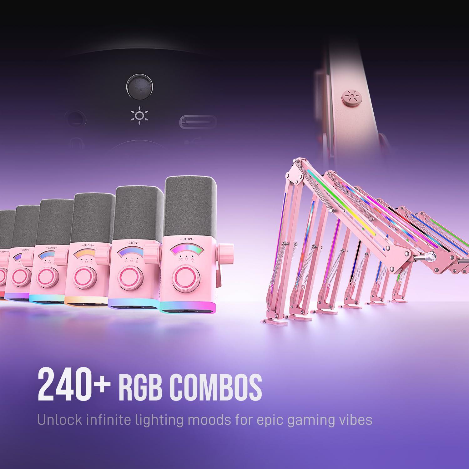 [Vibrant RGB Immersion] The streaming microphone kit customize your stream identity with uniquely curated pink-centric profiles—from soft rose transitions for cozy chats to vibrant magenta bursts for celebration moments. Dual-zone RGB creates depth—adding emotional visual depth to your storytelling.