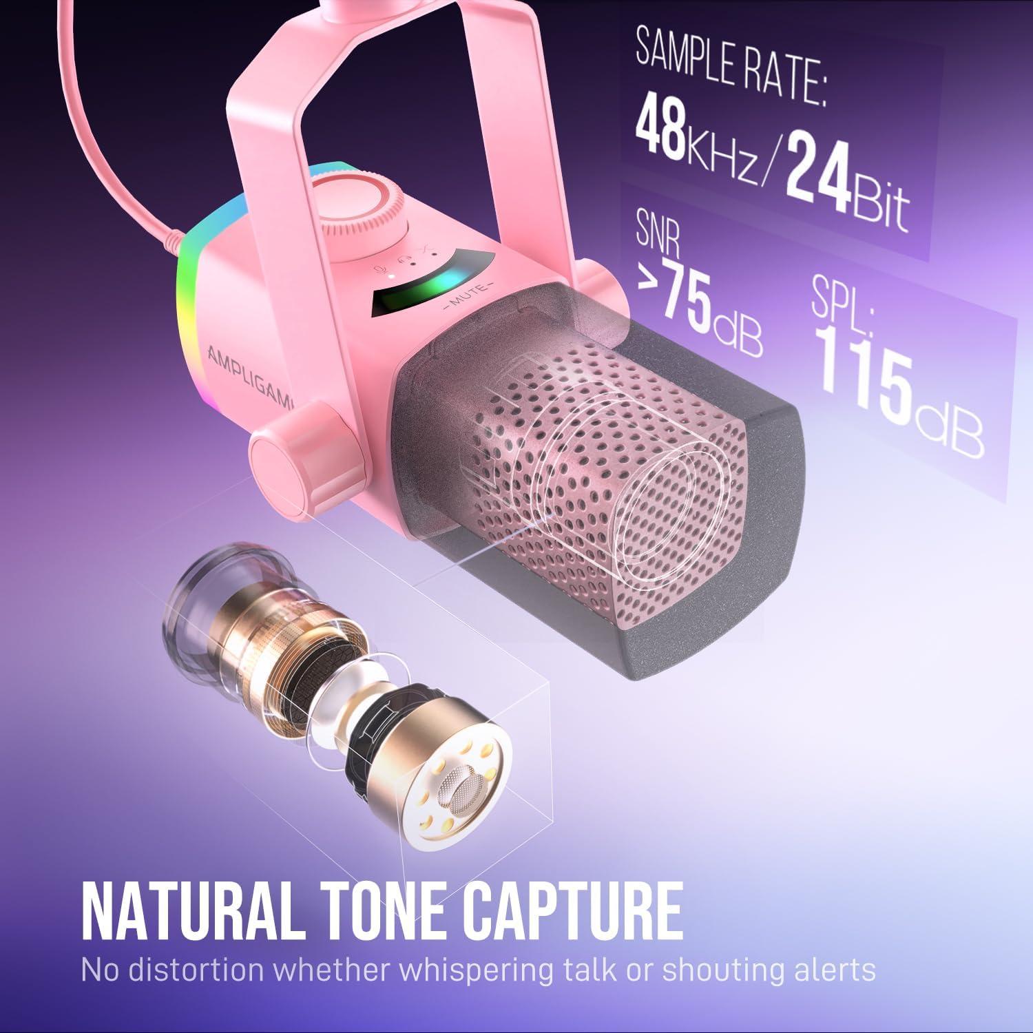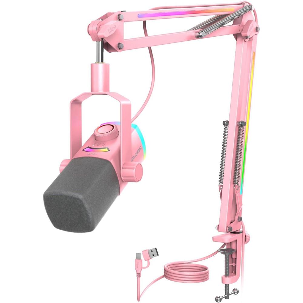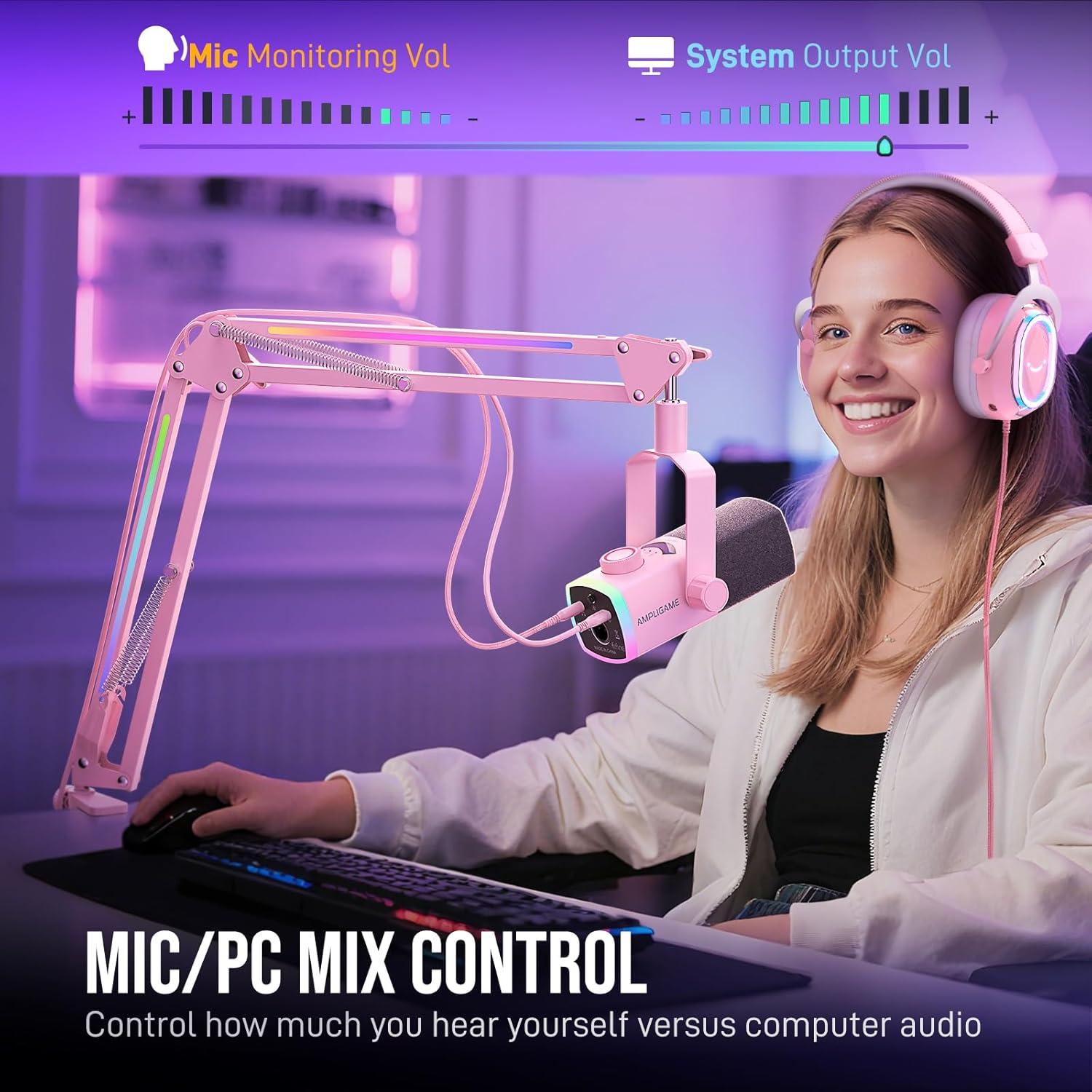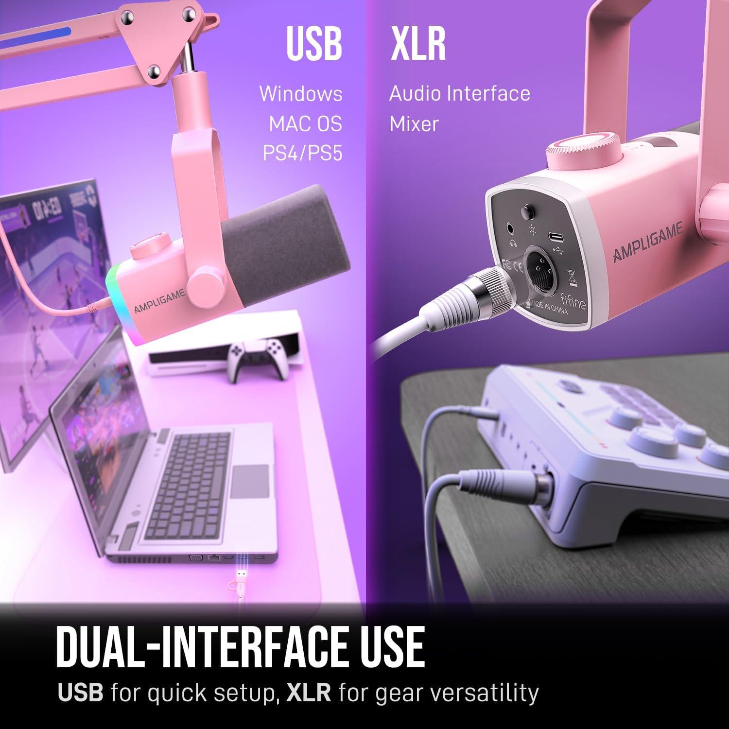 FIFINE XLR/USB Gaming Microphone Kit with Boom Arm Stand, RGB Streaming Mic for Computer Compatible with PC/PS4/PS5, Podcast Mic Set with Headphone Jack, Volume Knob, Mute-AmpliGame AM8PROT Pink(Pink)