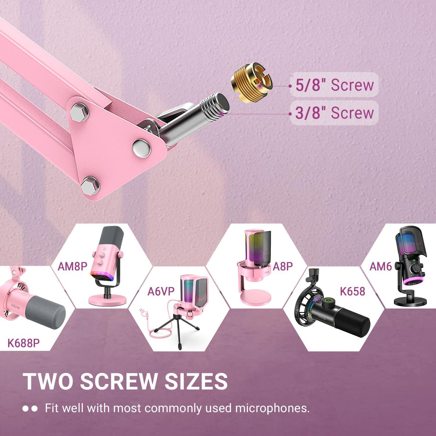 WIDE COMPATIBILITY-Coming with 5/8'' to 3/8'' metal adapter, the extendable boom arm is compatible with many microphones, such as the Fifine K669B, K670, K683A, K658, K688, AmpliGame (A6V, A8), AM8 usb microphones. (Mics are not included.) The mic stand is greatly suitable for gaming, streaming, podcasting or more scenes, and also friendly to recording beginner.