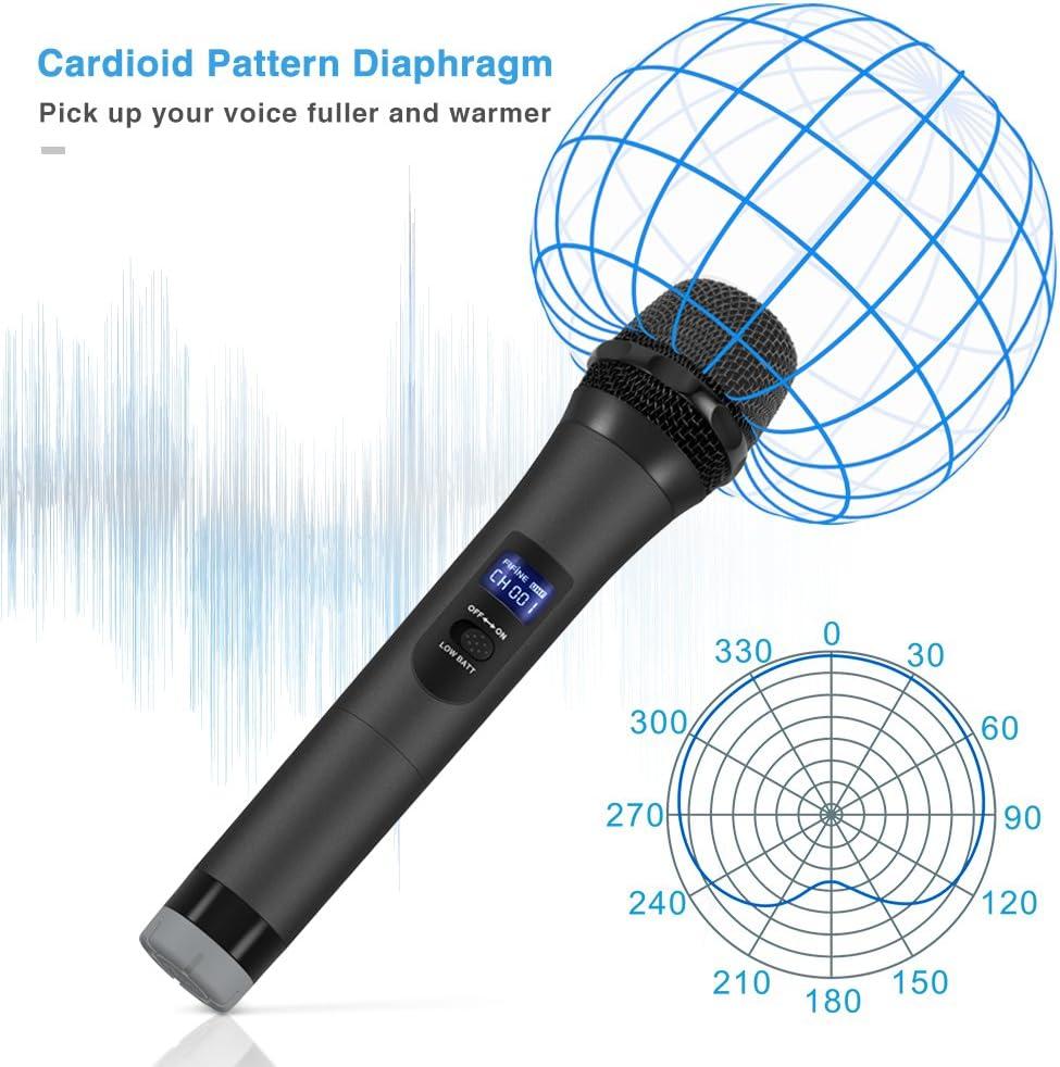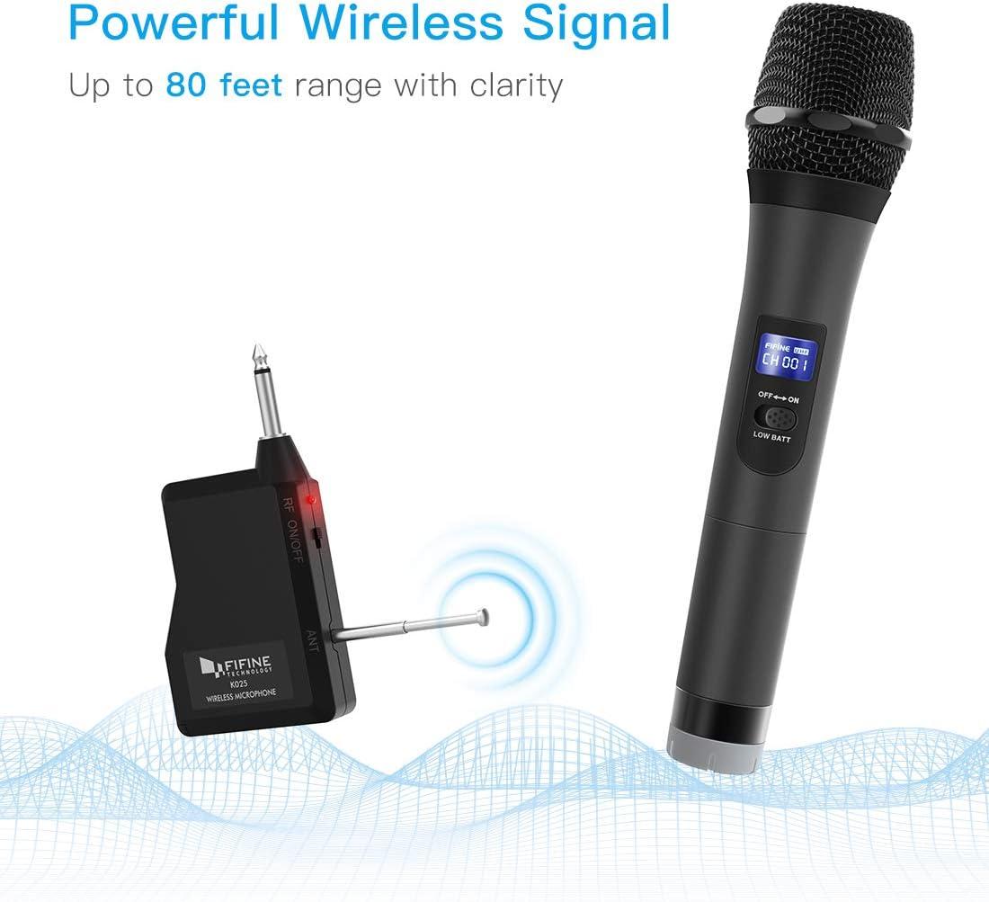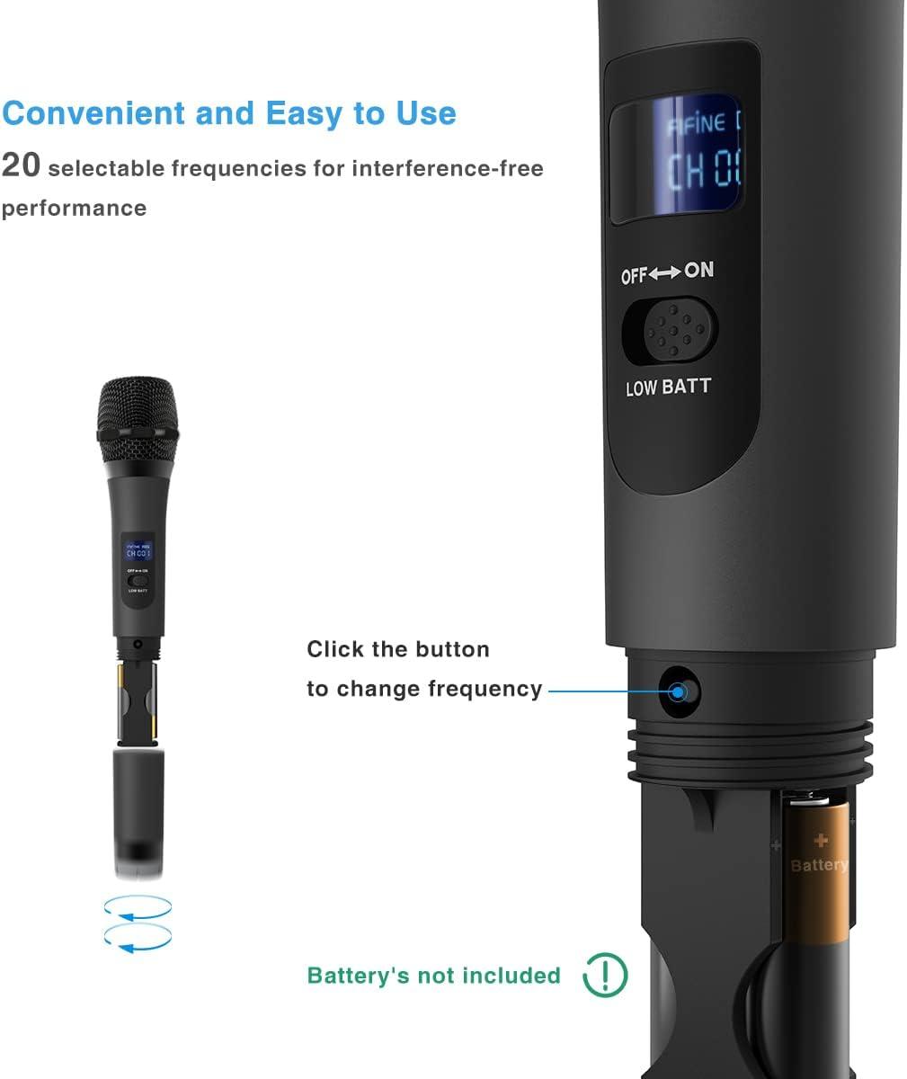 Convenient and Easy to Use–Plug and play. 20 selectable frequencies for interference prevention performance. Low-battery warning indicators on receiver and microphone, enables constant monitoring of system operation. Comfortable and easy to hold singing microphone, great for karaoke nights and smaller house parties to have some fun over the speakers.
